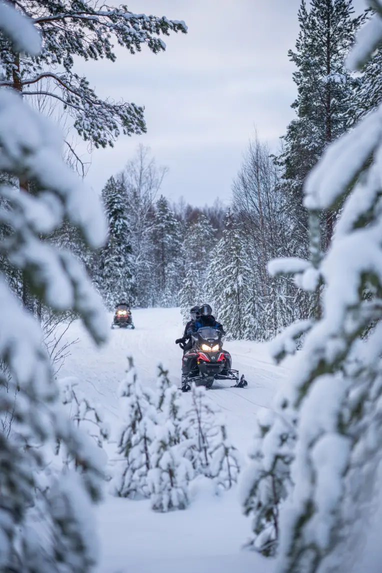 After a safety briefing and driving instructions, you’ll hop on your snowmobile and follow your guide into the white silence of the Lappish landscape. Ride through snow-covered pine trees, glide across frozen lakes, and take in breathtaking Arctic views.