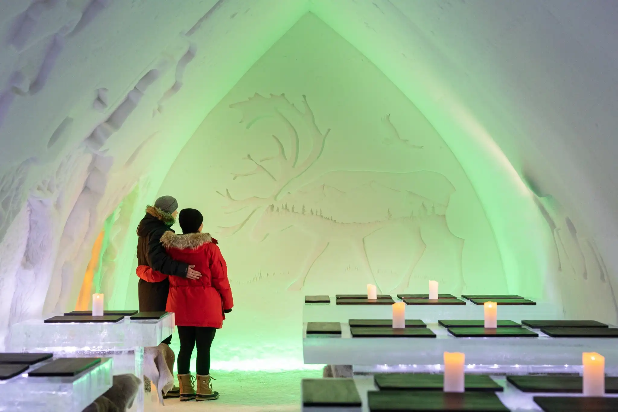 Upon arrival explore the enchanting rooms, detailed ice sculptures, and chapel — all built from scratch each winter by local and international artists. Learn about the building process, the history, and the magic behind this temporary wonder.